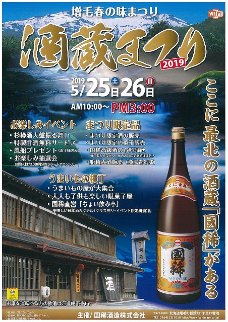 5月25日(土)26日(日)の両日、いずれも朝10時より夕方3時まで「増毛春の味まつり2019 酒蔵まつり」を開催いたします。当日は「まつり限定酒」の発売や無料試飲、お楽しみ抽選会等色々な企画で(詳しくはチラシをご覧ください)皆様をお待ちいたしております。是非増毛町・国稀酒造へ遊びに来てください。従業員総出でお待ち申し上げます。